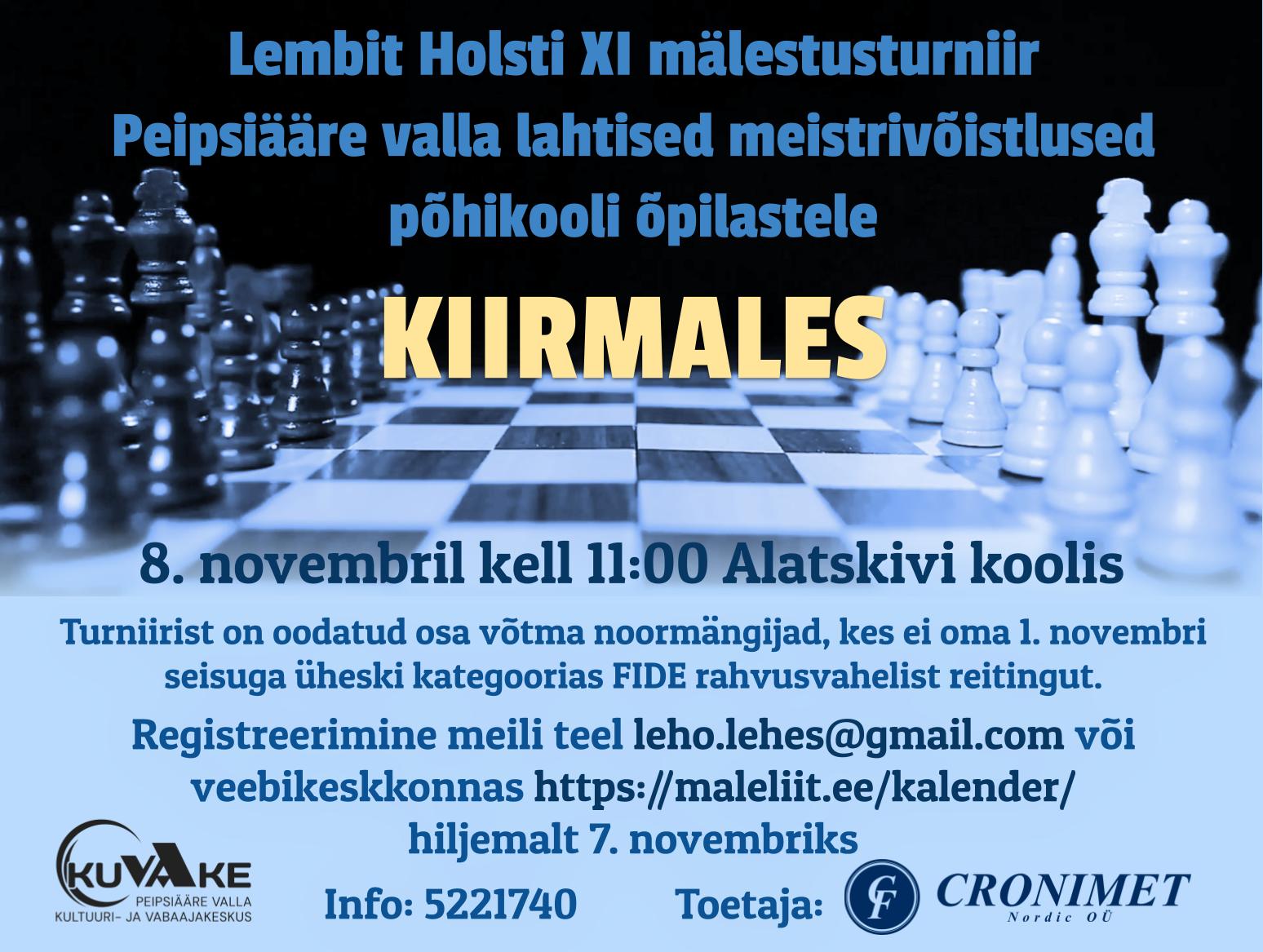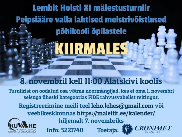 08.11 | L. Holsti 11. mälesturniir kiirmales koolinoortele 11.00 Alatskivi kool |