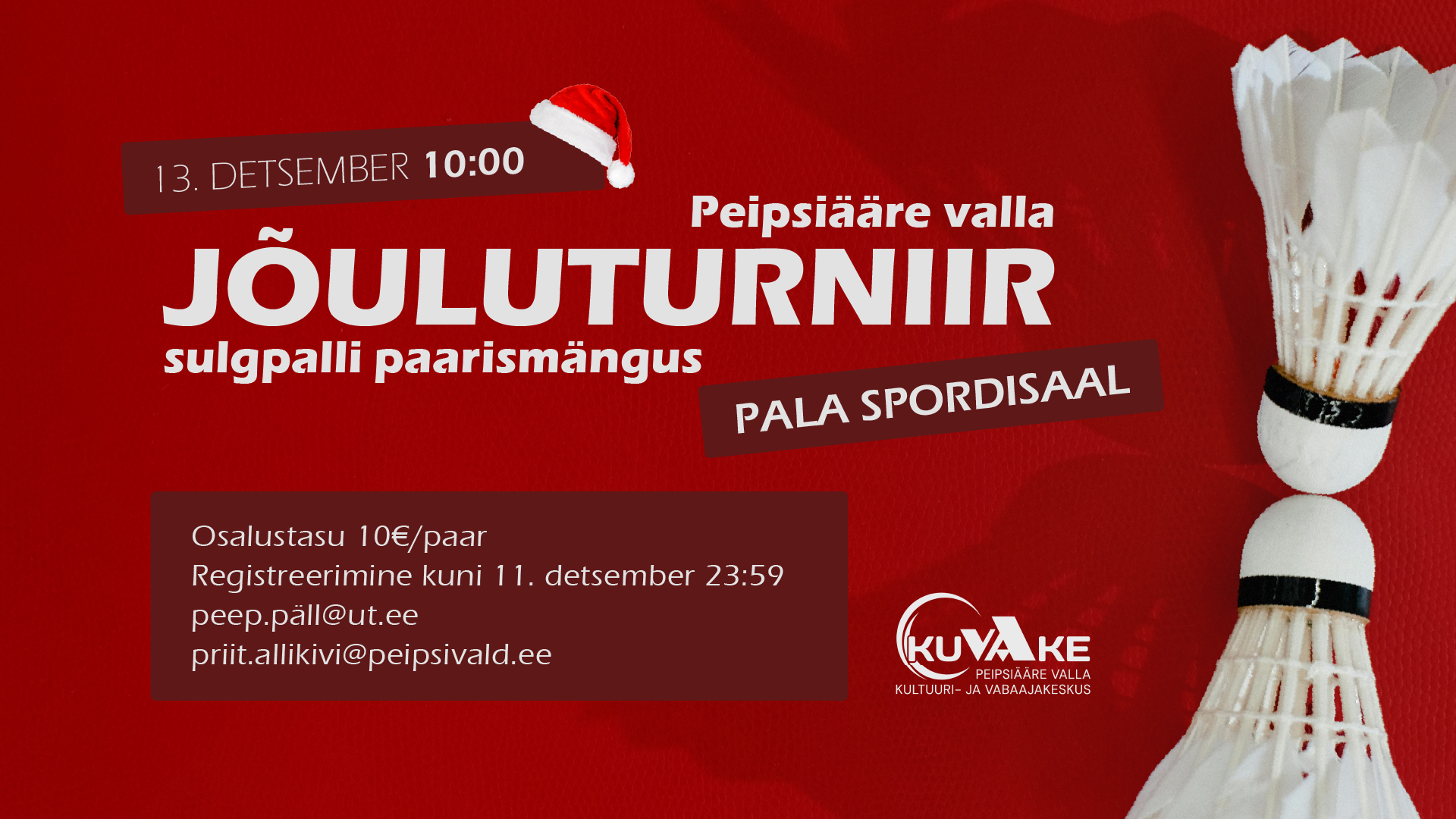 13.12 | Jõuluturniir sulgpalli paarismängus 10.00 Pala spordisaal |